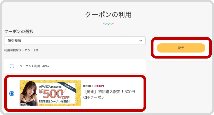 5. 「【動画】初回購入限定!500円OFFクーポン」を選択し、「決定」を押します。